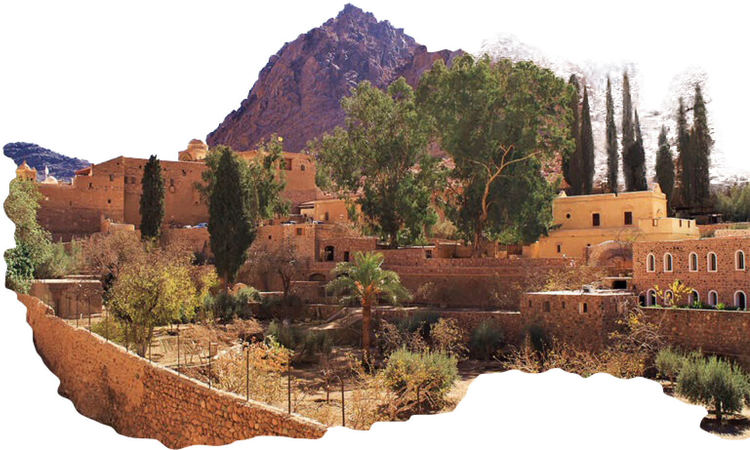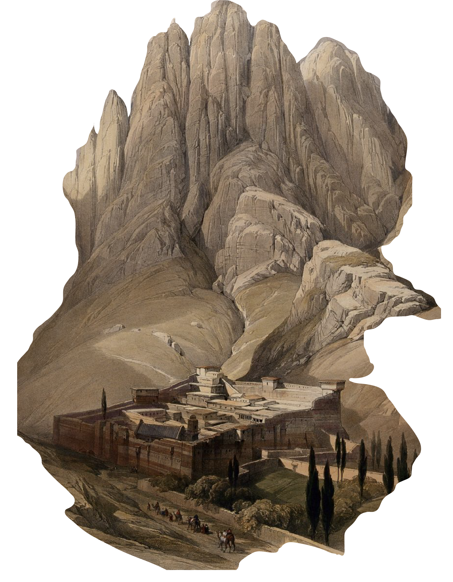 Sinai, KatharinenklosterDer Anblick des Gartens, an dessen Ende das Kloster liegt, ist so freundlich, so lachend, dass er die Reize eines jeden Orts in Europa erhöhen würde; der schlanke aufstrebende Wuchs der dunkeln Zypresse und der hellgrünen Pappel bildet mit der rankenden Weinrebe, dem laubvollen Nussbaum, den ausgebreiteten Aepfel-, Birn- und andern Obstbäumen die lieblichste Abwechselung, und das Ganze macht den auffallendsten Kontrast mit den Himmel anstrebenden Felsen von Granit, welche dies enge Thal bilden, und fast keine Spur von Vegetation verrathen.